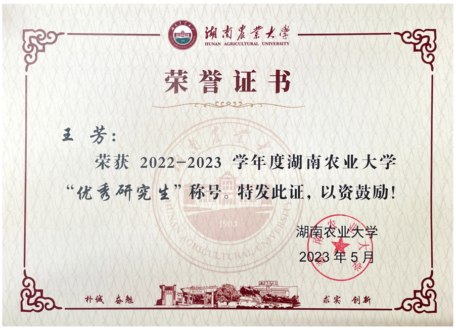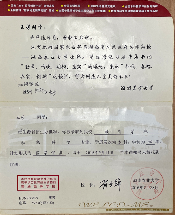 功夫不负有心人,2016年7月,王芳收到了304永利集团官网入口动物科学专业的录取通知书。大学期间,她坚持一以贯之的学习信念,积极参加社团活动,多次获得“三好学生”“优秀学生干部”等荣誉,并受304永利集团官网入口袁隆平院士的影响,坚定了科研之路。袁隆平院士在我们学院的新生入学典礼上进行以“知识 汗水 灵感 机遇”8个字为主题的演讲,激励了我去肩负起这么一个强农兴农的责任,也是我坚定去考取硕士研究生的想法,我想向老一辈农学专家们致敬。——中国科学院大学博士 王芳