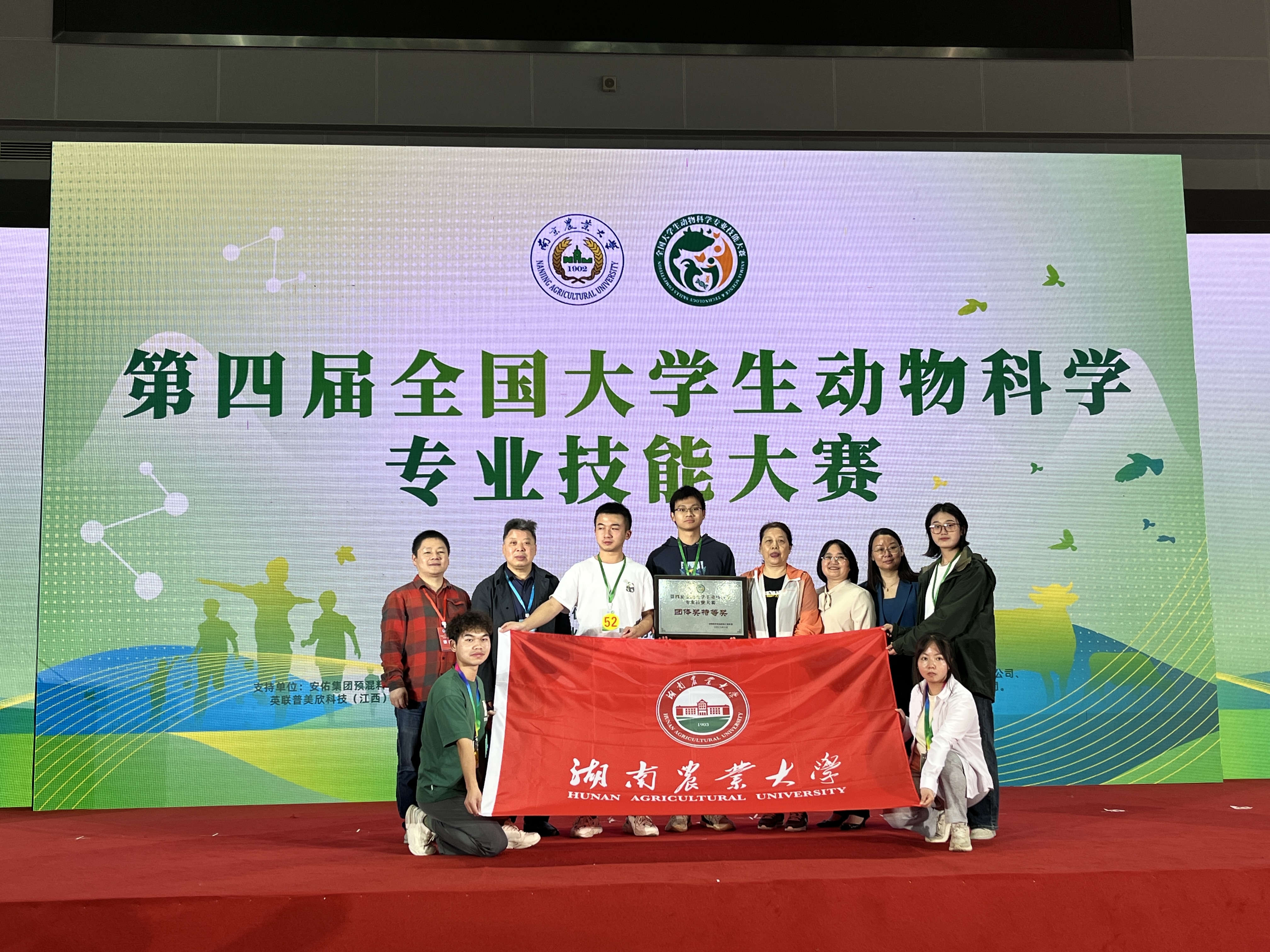 2023年10月27日-29日,第四届全国动物科学专业技能大赛在南京农业大学举办,来自全国各地69所涉农高校,700余名师生参加了比赛。永利官网牛科、封灿、李京、付鑫琳、邹振洲等五名同学凭借过硬的专业本领和充足的知识储备,经过激烈角逐,顽强拼搏,从参赛队伍中脱颖而出,斩获大赛团体特等奖和两个单项奖一等奖,充分展现了湘农学子的卓越风采。本次大赛设“生态畜牧场规划设计”“饲料原料快速鉴定与掺假识别-掺假鱼粉的鉴定”“鸡精液采集、品质检测及人工授精”和“猪外形评分、活体背膘厚与眼肌面积测定”等四个比赛项目,高凤仙教授、杨玲媛副教授、贺长青副教授和何俊副院长为项目指导老师。