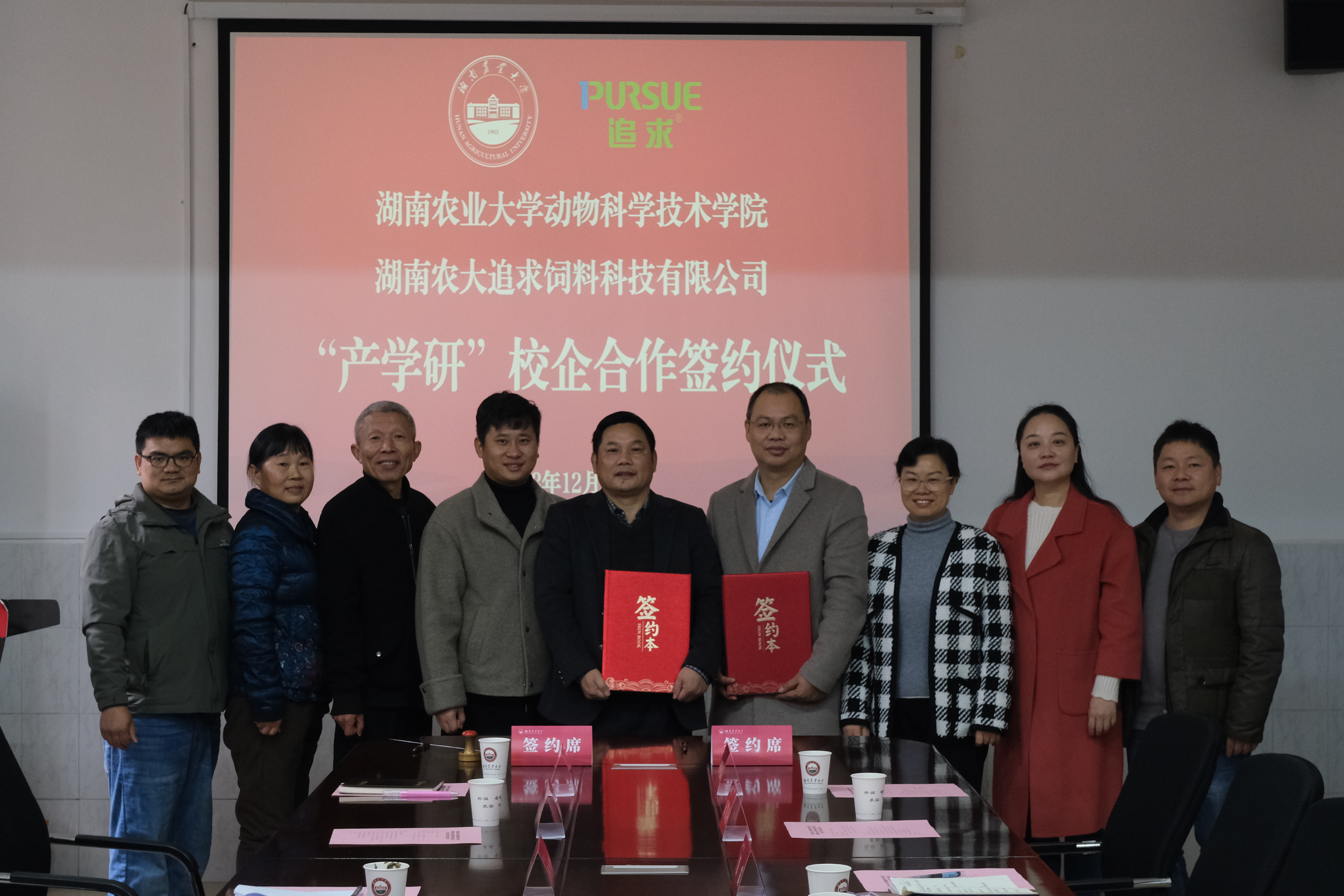 12月12日,304永利集团官网入口与湖南农大追求饲料科技有限公司“产学研”校企合作签约仪式在二教221会议室隆重举行。304永利集团官网入口院长贺喜、党委书记曾建英、党委副书记肖露、副院长何俊、农大追求公司董事长唐家、总经理唐大川,以及学院教师代表、企业代表共同出席本次签约仪式,曾建英主持签约仪式。