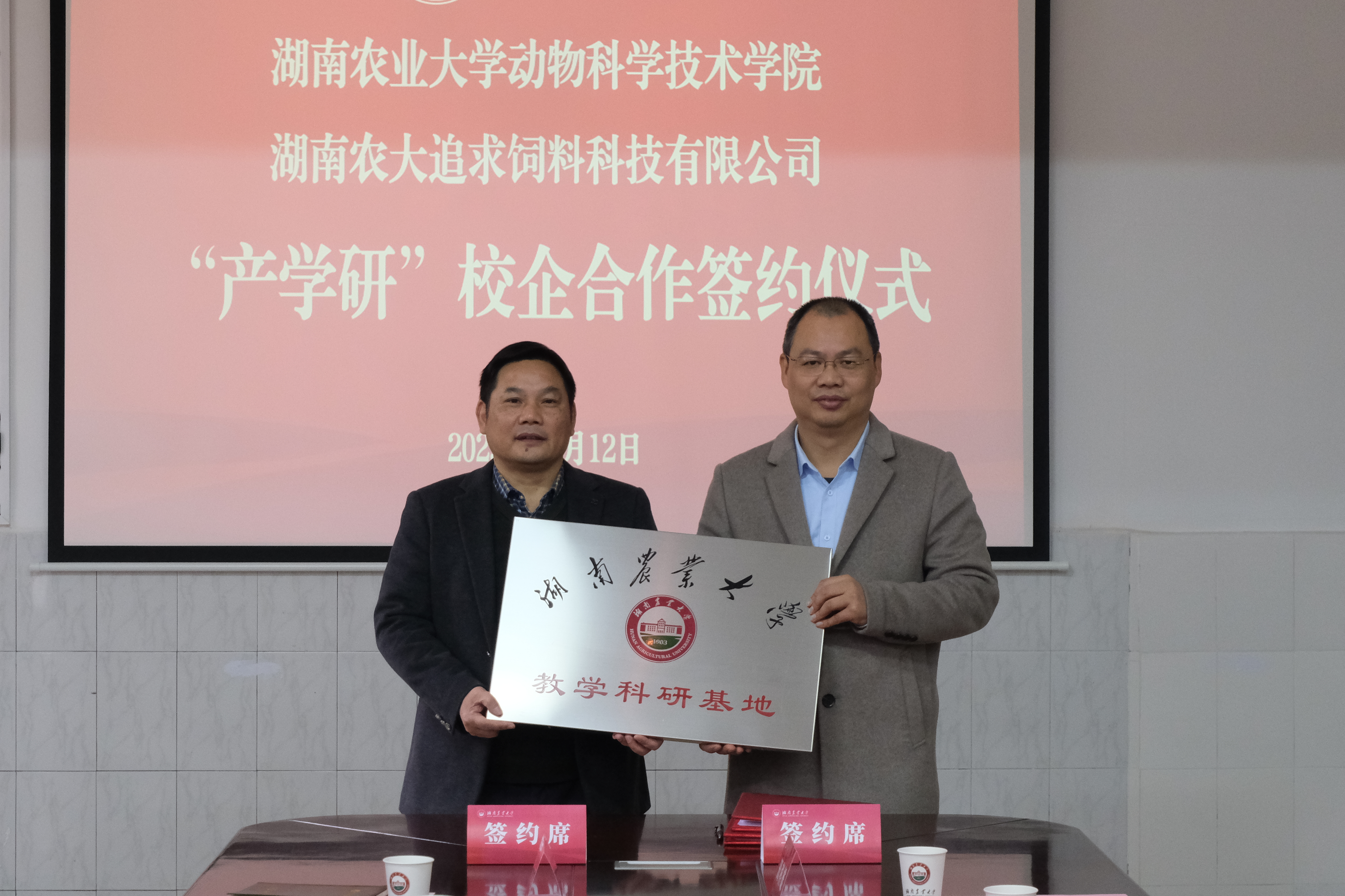 签约完成后,贺喜为追求饲料公司授“产学研校企合作”牌,全场鼓掌祝贺双方达成共赢协议。