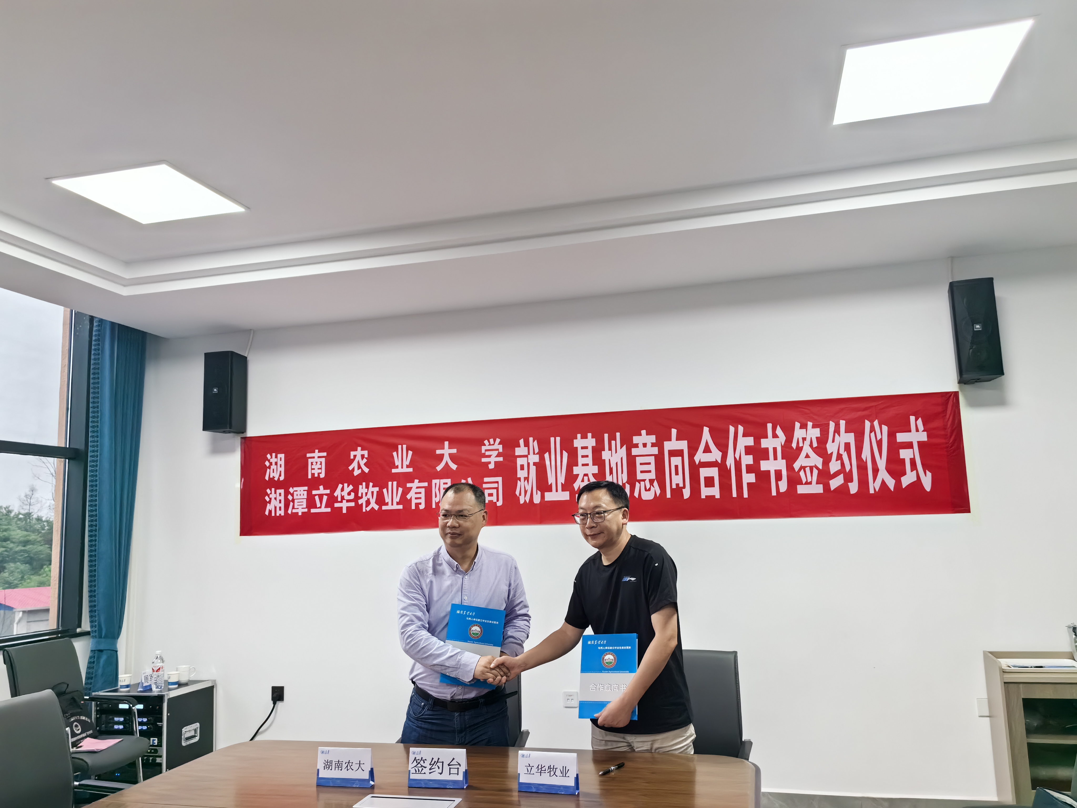 陈弘、易自力、马先锋、贺喜、祖智波分别为受表彰的优秀实习生颁奖。贺喜和戴为民分别代表学校与湘潭立华牧业签订了就业基地意向合作书。