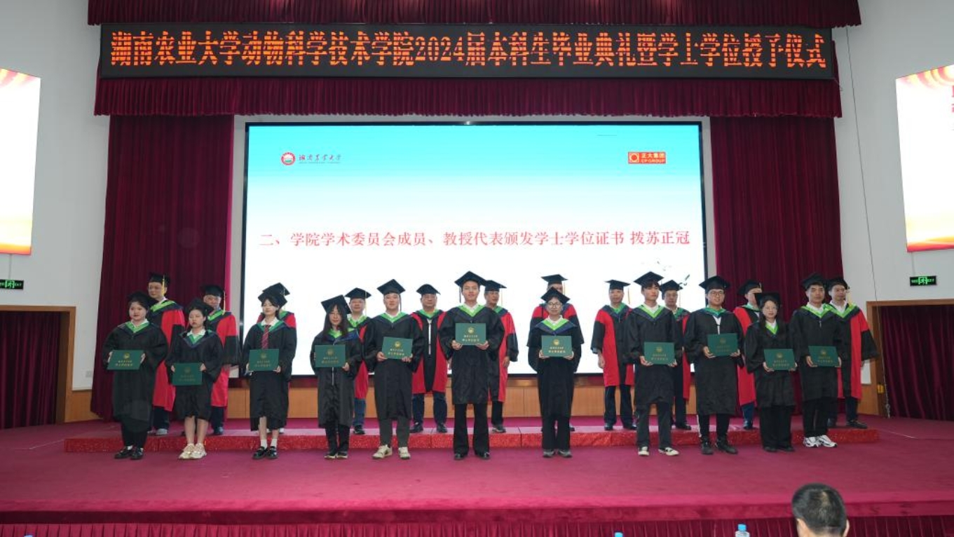 学院学术委员会主任黄兴国教授宣读《2024届本科毕业生学士学位授予审核决议》。随后,印遇龙院士、学院学术委员会成员、教授代表共同为毕业生拨苏正冠、颁发学位证书并合影留念。
