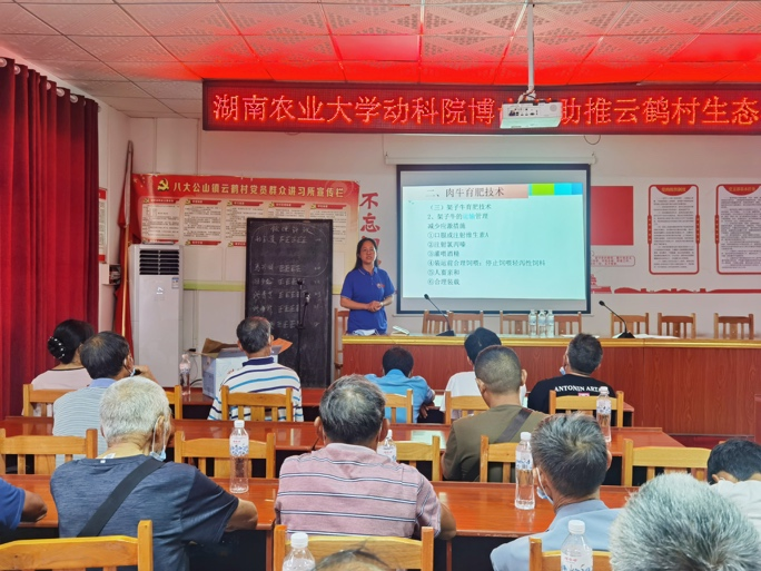 会后,“博士团”全体师生、政府部门负责人、云鹤村养殖户又紧锣密鼓地开展了相关的专业座谈会及养殖培训会,“博士团”指导老师方热军教授,就如何选择合适的牛羊品种、牛羊的消化特征、如何给牛羊提供合适的营养、牛羊饲料配制新技术四个方面,给出了专业的建议。桑植县“三区”人才张佩华教授,根据一路走访而来的细微观察,与村民们亲切互动,深入了解到养殖户生产过程中的实际问题,并进行现场问答。