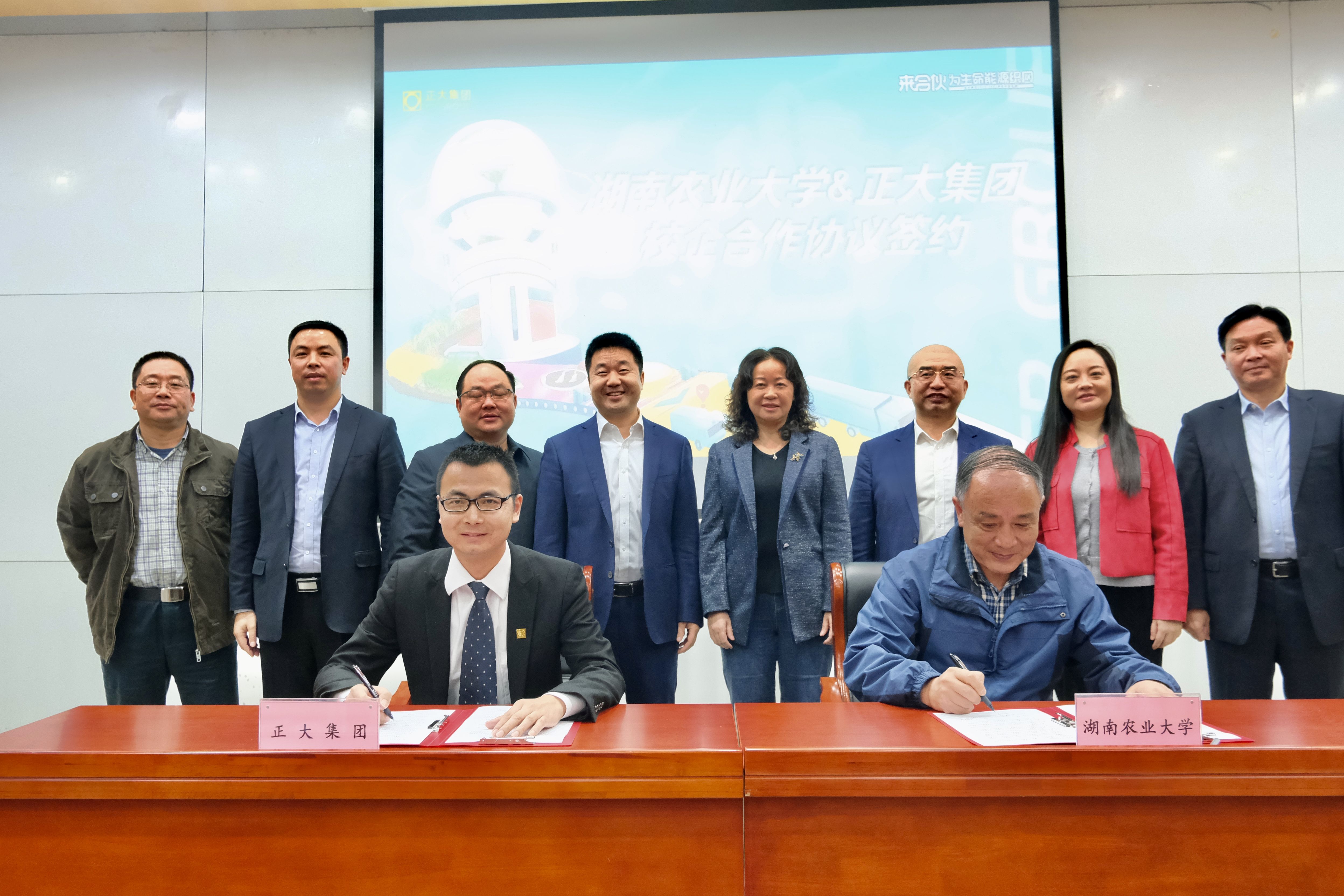 在校企合作协议签订过程中,动科学院王奎武书记与正大集团张道文总监代表双方单位进行签约,全场掌声雷动。随后,张立副校长、张胜利主任分别为邓红成总裁、张道文总监颁发校外就业创业导师聘书。校企合作不仅为正大集团培养输送了优质人才,提供了精英队伍,还为湘农学子创造了广阔的实习基地,为我校掌握学科前沿、面向市场需求进行精准科研创造了有利条件。
