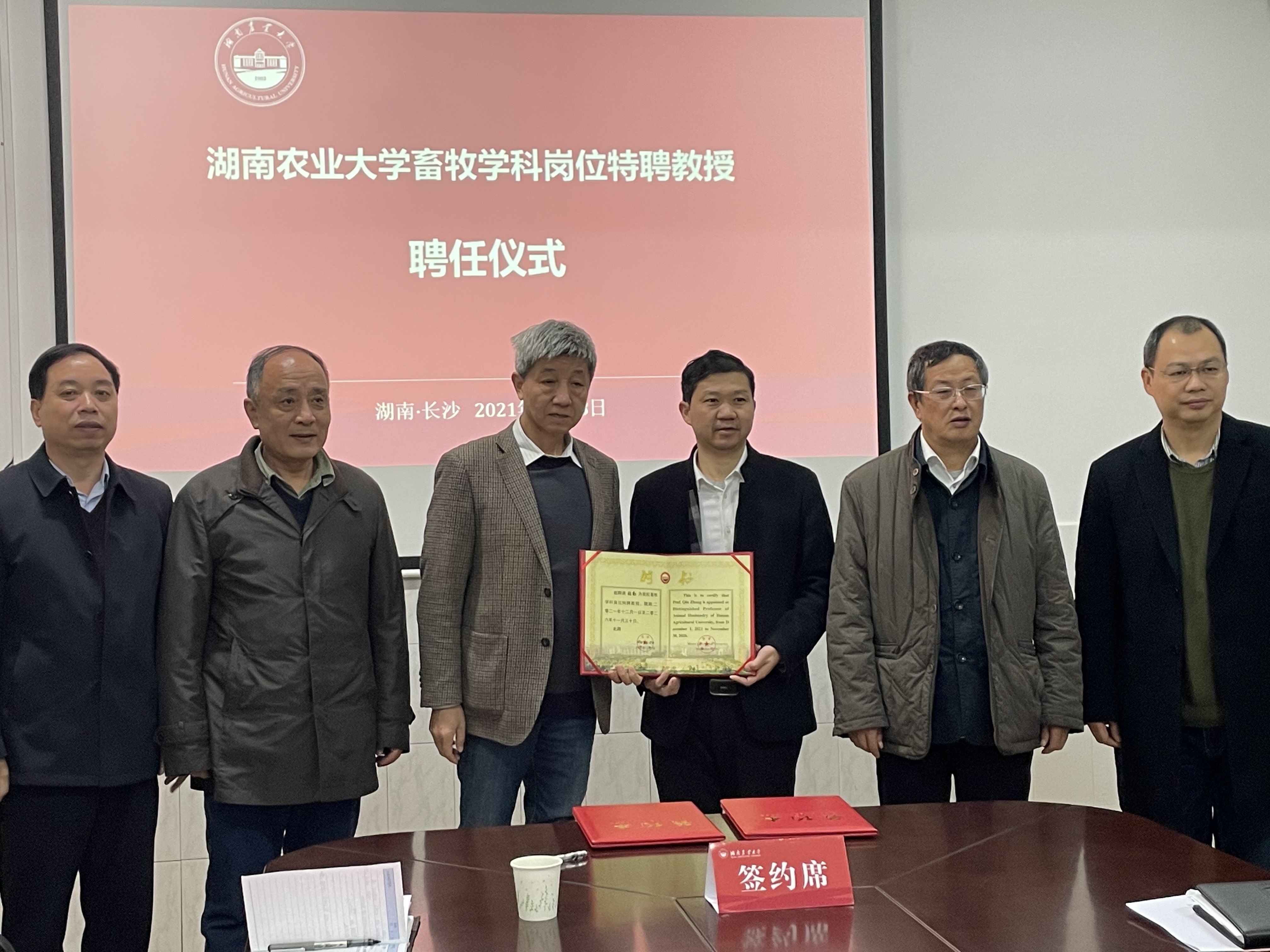聘任仪式上贺喜院长代表304永利集团官网入口与张勤教授签订聘任合同,人事处伍小松处长代表学校向张勤教授颁发聘书。贺喜院长介绍了张勤教授的主要业绩及学院聘任张教授的初衷,张勤教授的引进是在助推岳麓山畜禽种业创新中心建设、对接印遇龙院士动物遗传育种方向国家项目实施及加强畜牧学科动物遗传育种方向团队建设的背景下进行。