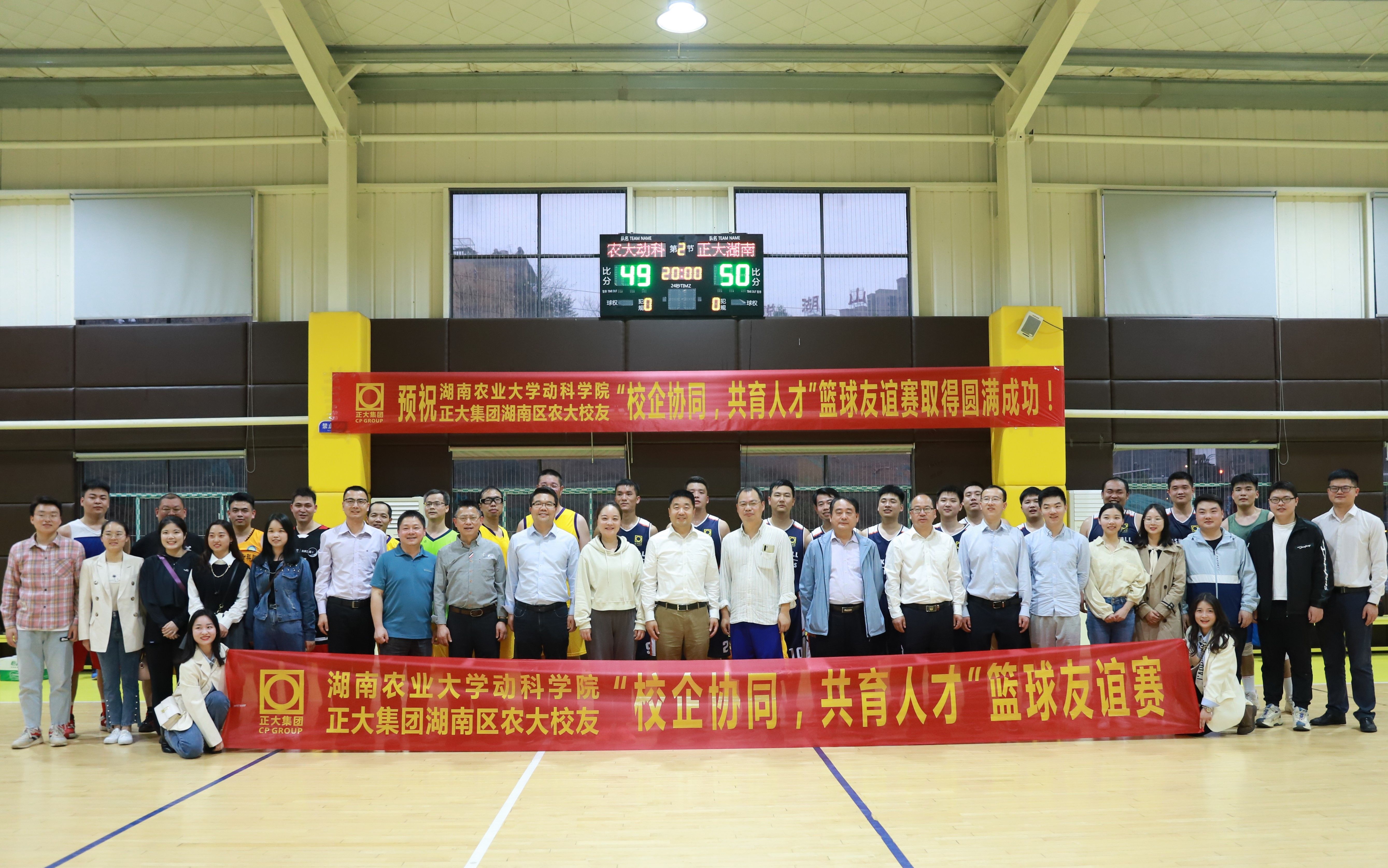 本次校企交流活动还打破了传统形式,精心策划组织了一场“校企协同,共育人才”为主题的篮球友谊赛。参赛队伍一方是湖南农大动科学院的领导班子、教授学者、辅导员老师,另一方则是已在正大就业工作的湖南农大学子。赛场上,双方实力旗鼓相当,双方队员全力以赴,积极防守、进攻,充分展现了他们娴熟的球技和极佳的竞技状态,彰显了“友谊第一,比赛第二”的体育精神。