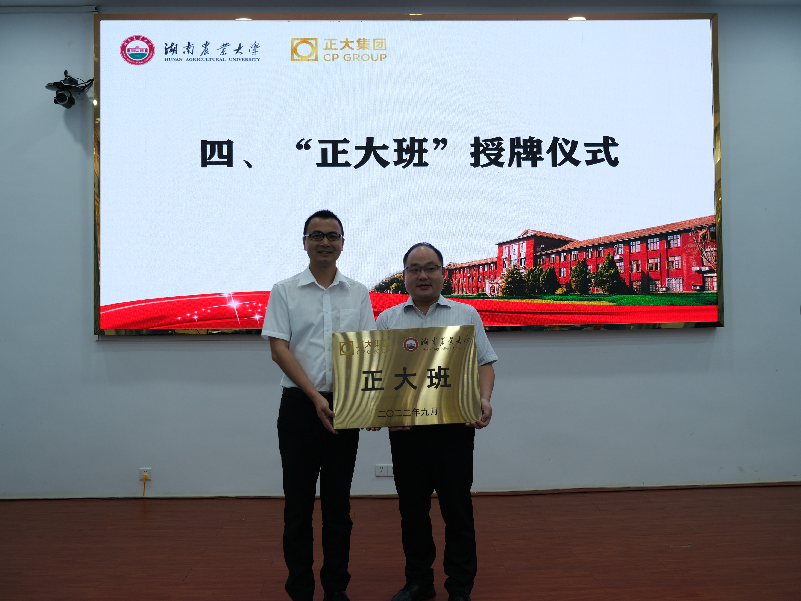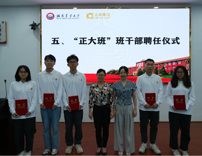 用心呵护,用爱履责,用诚育才。动科学院党委副书记肖露和正大集团湖南区资深总裁邓红成分别作为校方班主任和企业方班主任在“正大班”班主任聘任仪式中从张立副校长手中接过聘书。